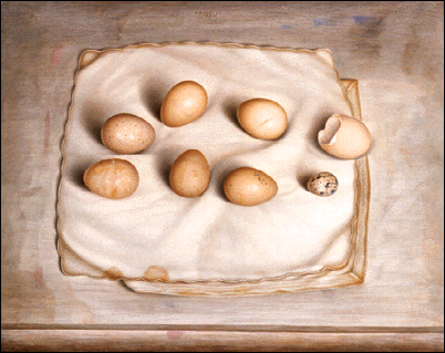 "Eggs on Handkerchief" 1993, acrylic on masonite, 40x50 cm