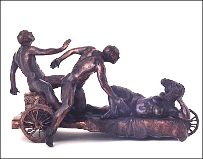 | Eigenlijk is Nicolas van Ronkenstein heel mild over het menselijk pogen om het leven te leven. Wie niet wil zien dat wijzelf modelstaan voor de ironiserende gebeurtenissen, die hij in brons gestalte geeft, is blind. Gelukkig, Van Ronkenstein grijpt terug naar een potpourri van mythologieën, waarin dezelfde potsierlijke vasthoudendheid aangaande ontuitroeibare misverstanden is terug te vinden. Want liefde, is dat nou een fata morgana, of is dat ons hoogste ideaal? |