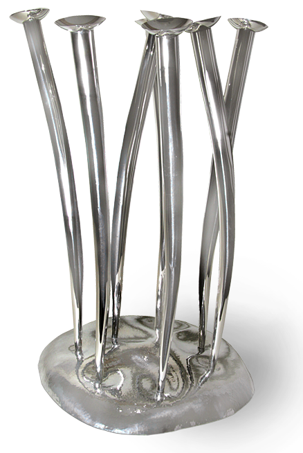 De bijna groteske vormgeving - het object zou net zo goed kunnen worden ingezet als bonbonnière in een op La Grande Bouffe lijkende context - blaast het oubollige van het vertrouwde uit uw geest. De overdaad aan zilver krijgt zijn contrapunt in de roestige bak, die als degelijk fundament dient voor het fragiel gehamerde zilver. "Melktijd" 2012 zilver 925 en ijzer, unicum ∅ 43 cm, h 50 cm € 9.000 |