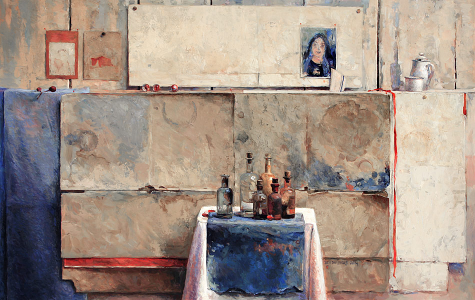 In dit piepkleine schilderijtje heeft Snijders alle belangrijke elementen zoals die in uiteenlopende schilderijen apart worden benadrukt, samengebracht, bijna terloops, zoals je in een dagboek een pagina volschrijft. De abstractie in voor- en achtergrond, de getekende tors van het naakt ter rechterzijde, het ikonische witte potje, de flesjes en nog zo wat bescheiden parafernaliën. Schilders beschouwen kleine schilderijtjes dikwijls als vrijblijvende tussendoortjes, maar bij Snijders torsen zelfs zijn allerkleinste paneeltjes de impressionistische monumentaliteit van de synthese tussen detail en ruige penseelvoering.