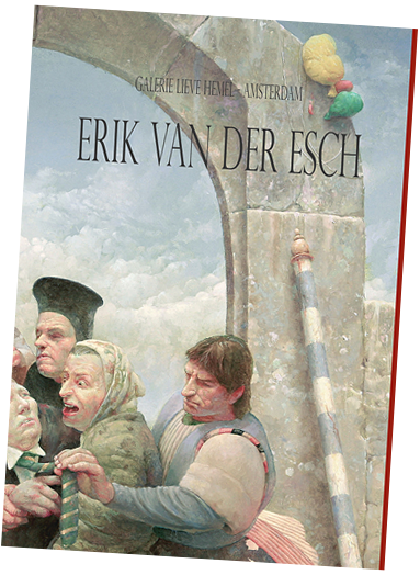 Dat is natuurlijk niet de bedoeling, maar is het niet zo dat in het moment, dat op het schilderij "Stropdas" wordt weergegeven, allerlei facetten tegelijk worden betrapt, zoals spot en ironie, maar ook begrip en mededogen? Ik neem genoegen met uw voorzichtige glimlach, en zeg dat ik me verbaas over het vermogen van Erik van der Esch om al met al zoveel mildheid voor al die menselijke strapatsen aan de dag te leggen.