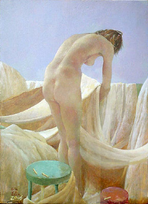 Click to enlarge "Naakt op Rode Achtergrond" 1992 olieverf/doek op paneel 54 x 38 cm € 4.500 De gewelfde roomblanke rug wedijvert met het licht van Saenredam, hoeveel prachtig rood de achtergrond ook naar voor tracht te brengen... Me realiserend dat Saenredam voor zijn tijd ongebruikelijk sober was in zijn kleurgebruik, voor zover je room als een kleur kunt beschouwen. En inderdaad, het gaat bij hem om het licht dat door de gewelven zwerft. Wat je zou kunnen interpreteren als de allerpuurste godsbeleving, ergens tussen visioen en bijna-doodervaring in. Wat niet accordeert met de aardse combinatie van kleuren, die Van der Esch heeft gekozen, of althans, als God en mens dan toch zijn samengesmolten in één alles overkoepelend inzicht, bij gebrek aan feiten vooralsnog, laat dan de rug van een godin en het meekraprood van een tijdelijk tentdoek toe als drager van de verzoening met eeuwige onzekerheid. |
