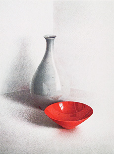 Lithograph G "Red Bowl and Grey Vase" 1989 image 54 x 42 cm, paper 65 x 50 cm three stones, seven colours, edition of 600 € 450