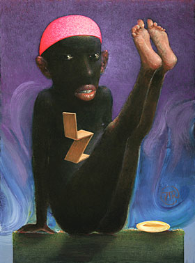 'Watermeisje' 2009, gemengde techniek/papier op karton 19 x 15 cm (verkocht-sold) ![]() "Harde Zit" 2012 gouache en gemengde techniek 26,5 x 20,5 cm - € 2.800 ![]() "Cherubijntje" 1976 tempera en alkyd/karton 19 x 11,8 cm (verkocht - sold) Dit schilderijtje is na zijn ontstaan in 1976 tot voor kort verborgen geweest in een particuliere collectie. Peter van Poppel schilderde het als ontwerp voor een boekomslag voor “De Laatste Eer” van F. Bordewijk, een bundel met grafreden. Een titel heeft het nooit gekend, en in mijn ogen leent die zwaarmoedige boektitel zich daarvoor niet echt, zeker gezien redelijk luchthartige manier waarop Van Poppel zich van zijn taak heeft gekweten. Een persoon bevindt zich in een souffleurshokje, met voor zich een leeg toneel. Het rechteroog voegt zich naar de droevige gebeurtenis en huilt uit volle borst, maar het linkeroog kijkt de toeschouwer guitig, om niet te zeggen vilein aan. Op het hokje zit een engeltje de vermoorde onschuld uit te hangen, na een kennelijk geslaagde poging de redenaar onbetamelijke gedachten in te fluisteren. Wat me beweegt het schilderij tot nader order met “Cherubijntje” te ondertitelen. ![]() "Vrij Paard" 2003 tempera en alkyd/karton op hout 26 x 19 cm (verkocht - sold) Laat u zich niet misleiden door de titel "Vrij Paard". Zoals gewoonlijk bij Peter van Poppel is ook deze kryptisch. De menselijke ogen van wat wij door toedoen van de titel als een paard zien, doen het beeld al wat kantelen. En wat zou een vrij paard moeten zijn als daar een mens op zit? Wees niet ongerust, op logica mag dit dan niet lijken, maar als ik associatie zeg, dan vindt u het helemaal niet vreemd als ik vervolgens uitleg dat het paard in dit schilderij symbool staat voor het lot. Ooit viel een vrouw van een paard, of ze zwerd afgeworpen, dat laat ik even in het midden, in het besef dat we het paarden niet kwalijk nemen als ze dat met hun ruiters doen. Paarden zijn vluchtdieren, in een schrikreactie vallen ze terug op dit patroon. De ruiter neemt dat voor lief, of negeert het lot, wat bloot legt dat we met het lot eigenljk niet goed raad weten. De vrouw brak haar been, en hield daar een deukje in dat been aan over. Voor Peter van Poppel reden om de vrouw met enige regelmaat in zijn schilderijen terug te laten keren. Het paard heeft in de loop der jaren de gedaante gekregen van een fabeldier, dat met de beste bedoelingen toch eeuwig onberekenbaar blijft. Zoals het lot dus, hoewel het lot weer geen bedoelingen heeft, althans, dat vermoedt men. ![]() "Monameester" 1973 acryl en olieverf/hechthout 24 x 20,5 cm (verkocht - sold) Afgebeeld in het boek Groot Atelier (p. 39), met als onderschrift "De samensmelting van de Mona Lisa met de Schoolmeester met Kind van Westerik". ![]() "Kleine Ikonenschilder" 1976 olieverf/paneel 11,5 x 9,1 cm (verkocht - sold) ![]() "Kleine Blote Kont" 1975 olieverf/paneel 6,2 x 8,3 cm (verkocht - sold) Afgebeeld in het boek Groot Atelier (p. 54), met als onderschrift "Sommige titels doen weinig subtiel aan. Dat komt doordat ik werktitels zo vaak gebruik in notities en brieven dat ze al snel definitief worden". ![]() "Stouterd" 2015 gouache en gemengde techniek 18,2 x 13,8 cm (verkocht - sold) ![]() "Knipoog" 2010-2018 gouache en gemengde techniek 27,5 x 19 cm (verkocht - sold) ![]() "Utrechtse Poëzie" 2012 gouache en gemengde techniek 18,2 x 17,2 cm (verkocht - sold) ![]() "Zoet Geluk" 2003 tempera en alkyd/karton/paneel 15,7 x 26,5 cm (verkocht - sold) ![]() "Zigzag" 1997/2004 tempera en alkyd/karton/paneel 31,2 x 23,4 cm (verkocht - sold) ![]() "Wit Kind" 2011-2012 tempera en alkyd/karton/paneel 19,2 x 20 cm (verkocht - sold) ![]() "Zeg Maar Titi" 1990-2000 tempera en alkyd/karton/paneel 29,5 x 21 cm (verkocht - sold) ![]() "Sneeuwduif" 2013 tempera en alkyd/karton/paneel 22 x 16 cm (verkocht - sold) ![]() "Oorbelleke" 1998-2000 tempera en alkyd/karton/paneel 30 x 23 cm (verkocht - sold) ![]() "Griekse Manieren" 2005-2010 tempera en alkyd/karton/paneel 25 x 19 cm (verkocht - sold) |