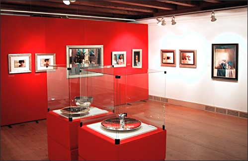Op de rode achterwand contrasteert het "woeste" schilderij "Blauwe Ridderspoor met Witte Kan"