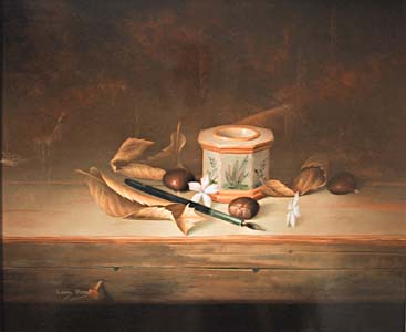 León Olmo, "Stilleven met Kroontjespen" 2000, olieverf/paneel, 38 x 46 cm
